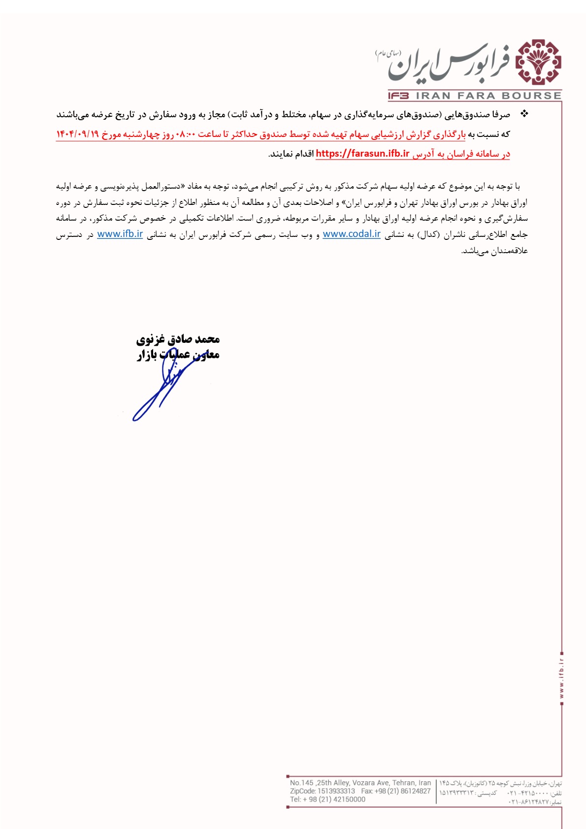 زمان ثبت سفارش بانیان: چهارشنبه مورخ 1404/09/19