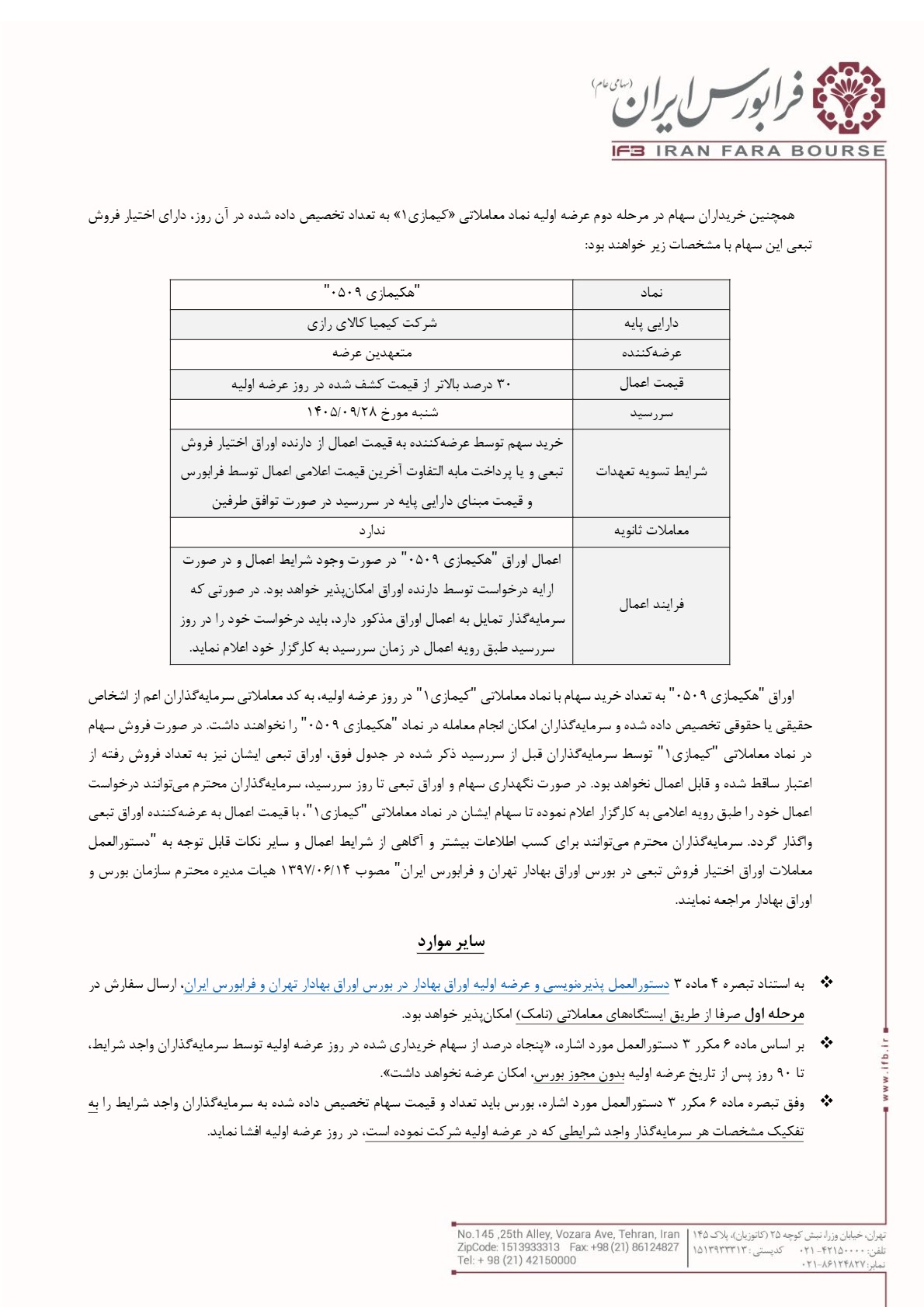 بر اساس اطلاعیه شرکت فرابورس ایران، روز چهارشنبه مورخ 26 آذر ماه 1404، تعداد 64/200/000 سهم، معادل 12 درصد از سهام شرکت کیمیا کالای رازی با نماد معاملاتی «کیمازی» عرضه خواهد شد، این عرضه اولیه به صورت ترکیبی و در دو مرحله انجام خواهد شد.